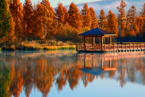 湖光山影簇映小楼,古松苍郁、清远幽寂。北极泉风景区位于漠河县图强镇木石神山之下,为北京百环房地产实业有限公司出资兴建。