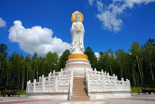 北极林海观音圣像10.8米座北朝南,南北相望,遥相呼应。特别是当北极星最亮之时,正好处在佛像上方,预示着佛光普照,国泰民安,世界和平,真可谓集天地之造化,聚山河之灵气,令人叹为观止。