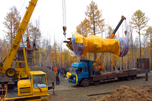 20069221008分,伴着绵绵的秋雨,开始圣像吊装固位,南山寺智法大师和弟子永怀法师口诵经文,祈福圣像奉安漠河,普度众生。当莲花宝座托起的北极林海观音圣像被吊装固位在基座上时,厚厚的云层突然闪射出一道缝隙,一缕灿烂的阳光不偏不倚映在观音圣像上。这一神奇景象使在场的人们啧啧称奇叹为观止,不约而同地欢呼起来。