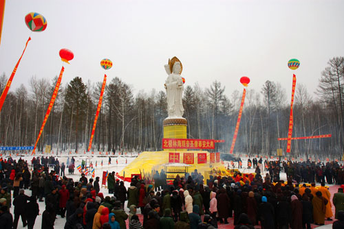 这一天,整个大兴安岭,漠河全县,尤其是漠河县所在地西林吉镇,更是万人空巷,盛况空前。她已成为漠河四周千里方圆无人不知无人不晓的一大盛事。长春、哈尔滨、齐齐哈尔、满洲里、海拉尔、根河、黑河等地的信众,他们闻讯后不辞辛苦,怀着一颗朝圣的心提前赶来。人们象过节日一般,以无比喜庆无比尊崇的心情早早地起来。人们互相转告,人们互相传颂,人们互相约定,人们互相提醒;人们扶老携幼,人们弹额像庆,人们焦急等待,人们呼唤心声;人们肃穆心情,人们净化心灵,人们端庄仪表,人们神情凝重;人们分外高兴,人们摩肩接踵,人们众口一心,人们无比虔诚;大家景仰着,大家期待着,大家庆幸着,大家祈祷着;宏大的法事到场中让人们由衷地感到,白雪更白透彻魂灵,绿海更绿轻心更轻,蓝天更蓝气氛更浓,信众更信诚心更诚。但只见法事到场上,祥云缭绕观音山中,山谷回荡天籁之声,香火旺盛一派圣境,如法如仪空灵庄重。法事到场内,大红地毯铺在中央,18名法师排列前方,居士信众整齐登场,场外群众围观四方。整个法事活动安排的紧凑有序,热烈庄重。诸位法师大德庄重地为北极林海观音圣像诵经祈祷,上香拜朝,围绕圣像沿顺时针方向转三圈祈福,杨柳枝洒净圣水……一生都很少亲眼见过的法事道场使大家大开了眼界,人人都受到了一次心灵的洗礼。