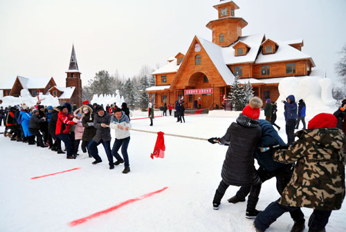 打雪仗、雪地拔河现场团队齐心聚力,欢呼呐喊,你追我赶,游客们乐享其中,忘却了极地严寒。